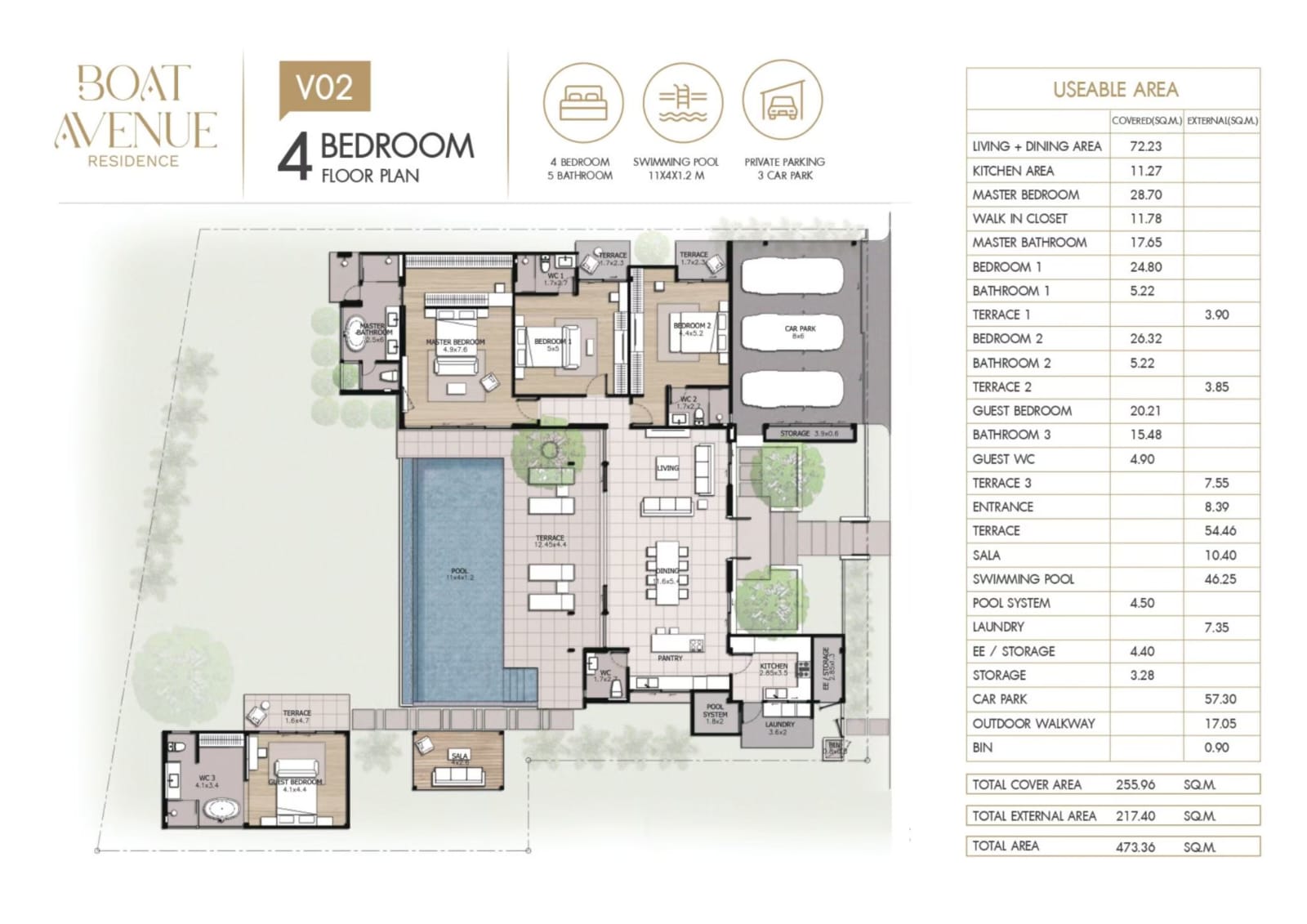 ● Spacious Accommodation: Premium 4-bedroom, 5-bathroom floor plans designed to offer ultimate comfort for large families or groups.